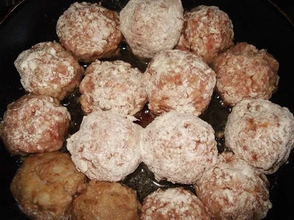 5. Сформировать тефтели диаметром примерно 4,5 — 5 см. Обвалять в муке. Выложить на разогретую сковороду с растительным маслом. Обжарить со всех сторон (занимает примерно 5 минут); крышку не закрывать. Затем налить в сковороду 1 стакан кипятка так, чтобы вода была до половины уровня тефтелей. Тушить 10-15 минут.