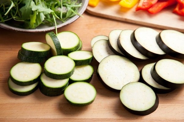 Баклажан и цукини нарезать кружками.