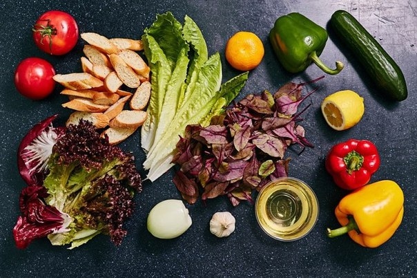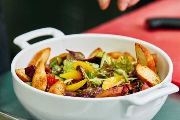 Листья салата промыть в большом количестве воды и хорошо просушить. Добавить в миску к овощам.
