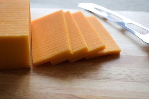 Сыр Чеддер нарезать на кусочки шириной 0,5 -0,7 см.