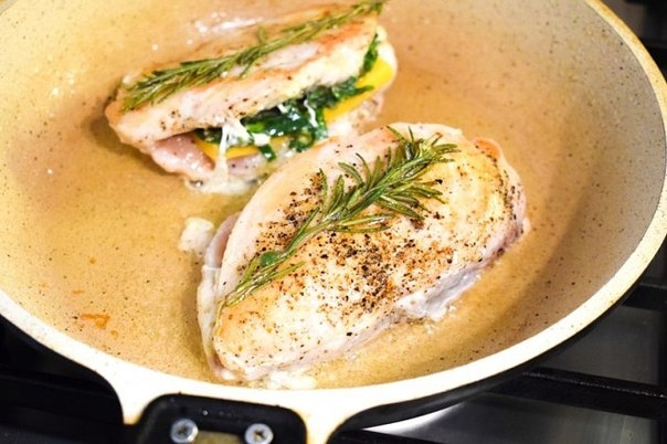 Обжарить на растительном масле на хорошо разогретой сковороде фаршированную грудку с двух сторон в течение 2 минут на каждой стороне. Во время жарки положить в сковороду веточки розмарина.