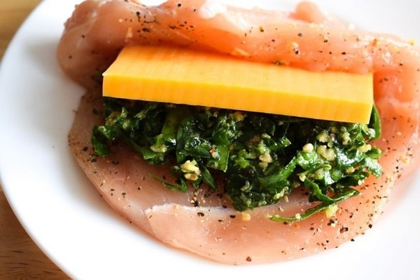 Выложить на грудку шпинат с орехом и кусочек сыра. Завернуть грудку в конверт.