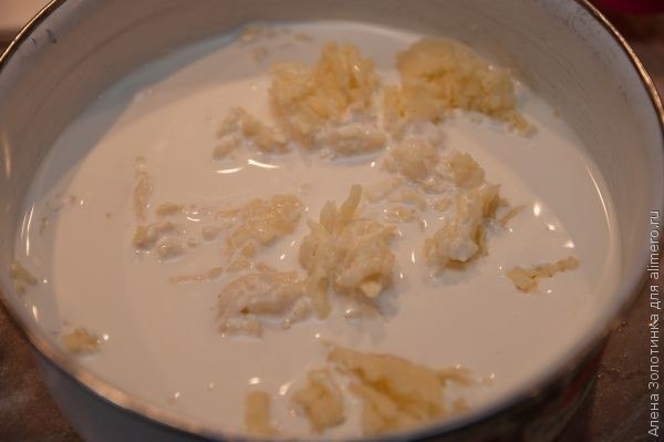 Приготовить соус — смешать оставшиеся две трети сыра со сливками и молоком (если у Вас сливки 10%, то молоко добавлять не нужно).