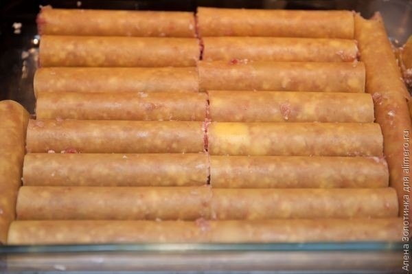 Уложить трубочки в огнеупорную посуду — лучше укладывать в один слой.