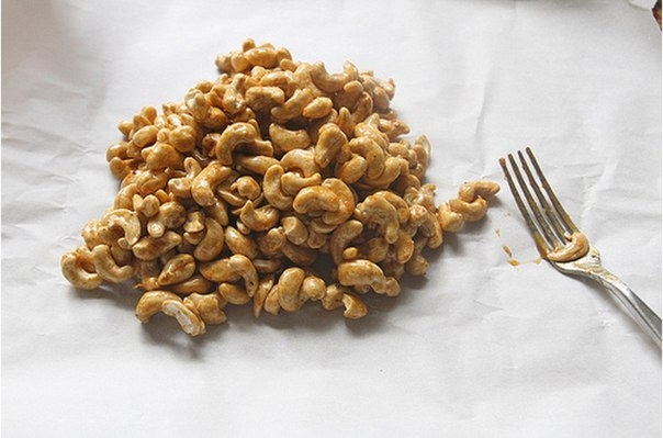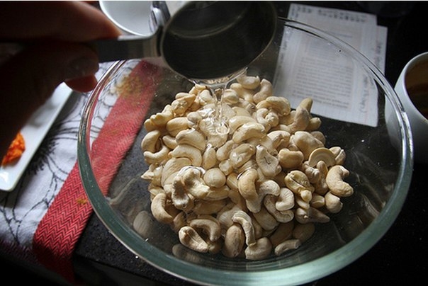 3. Поместите кешью в глубокую тарелку или миску и полейте кукурузным сиропом.