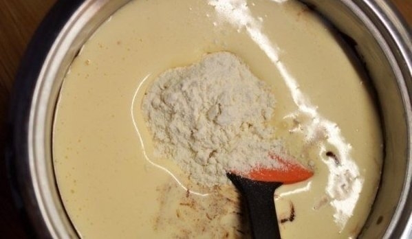 3. Получившуюся яичную массу добавляем к растопленному шоколаду. Перемешиваем лопаткой. Добавляем в получившуюся смесь муку. Перемешиваем. Да, важное замечание - добавлять и муку, и яичную массу нужно в уже остывший до комнатной температуры растопленный шоколад. Если добавите в горячий - получится ерунда.