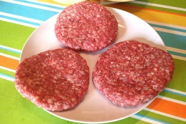 2. Приправьте фарш перцем и солью по вкусу. Сформируйте 3 котлеты, предварительно смочив руки холодной водой. Смело лепите котлеты большого диаметра - при жарке они уменьшатся.