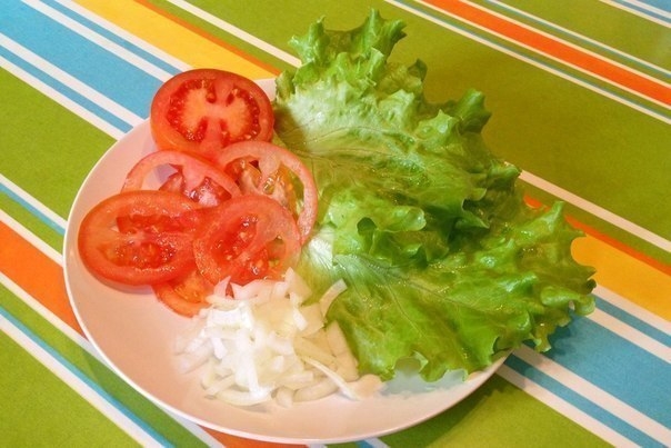 1. Порежьте помидор тонкими кольцами. Подготовьте листья салата и крупно нашинкуйте лук. Вы также можете использовать красный лук, нарезанный кольцами.