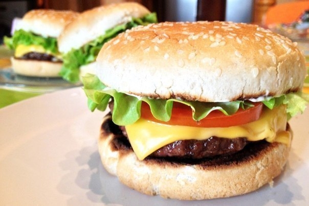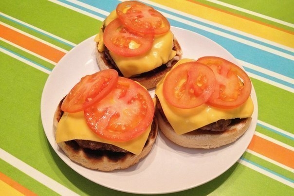 6. Готовые котлеты выложите на булочку с соусом и луком. Пока котлеты горячие, положите на них ломтик сыра. Сверху добавьте колечки помидоров.