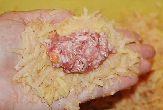 4. Взять в руку немного натертого картофеля и хорошенько отжать, распределить на ладони отжатый комочек. Положить начинку.