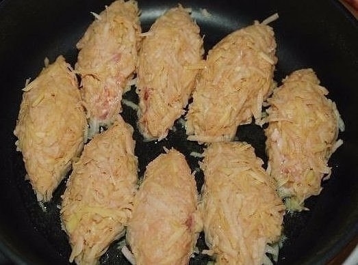 6. Сделать ладони «лодочкой» и сформовать зразу продолговатой формы (слой картошки должен быть не слишком толстым, чтобы хорошо прожарился).
