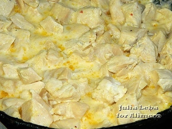 Куриную грудку промыла, порезала на кусочки. Выложила на сухую сковороду (никаким жиром не смазывала).