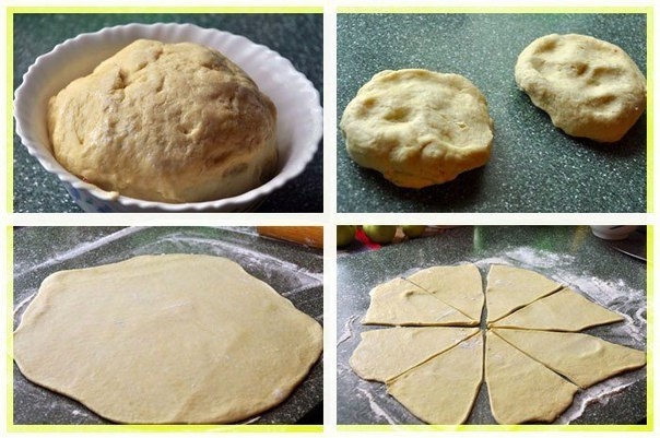 8. Тесто разделила на две части. На столе, слегка посыпанном мукой, раскатала каждую часть в "круг" диаметром примерно 40 см, и нарезала его на 8 секторов.