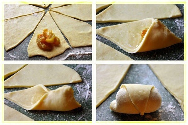 9. В широкую часть сектора выложила примерно две чайные ложки яблочного конфитюра и прочно слепила края так, чтобы начинка не вытекала, а затем свернула в рогалик.