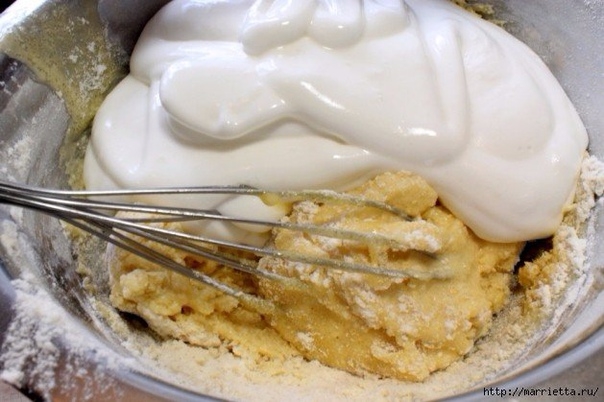 Затем, добавив взбитые белки, аккуратно вводим пышную белую массу в тесто; работаем бережно и доводим консистенцию до полной однородности.