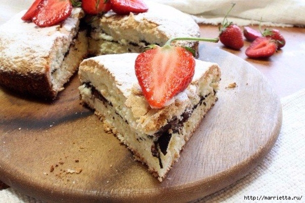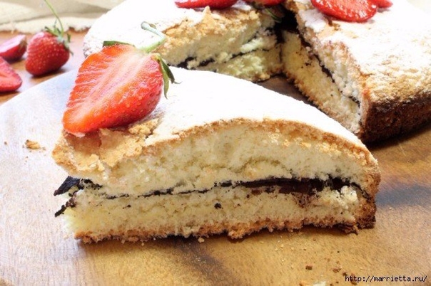Мягкий, воздушный, с тонкой шоколадной прослойкой бисквитный пирог отлично сочетается со сладкими клубничными кусочками, не требуя дополнительных соусов,топингов и/или глазури.