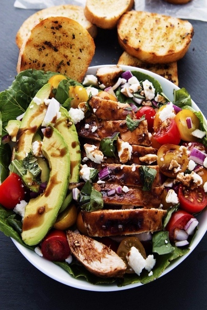 Сверху салата выкладываем курицу. Рядом кладем брускетты.