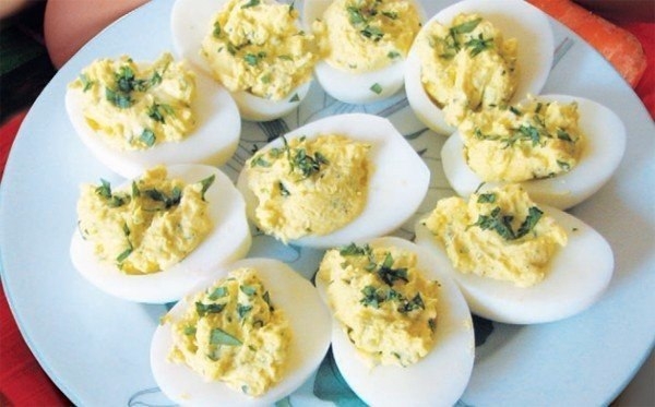 Нарезать каждое яйцо пополам вдоль, аккуратно удалить желтки. К яичным желткам добавить горчицу, сметану, лук-шалот, копченого лосося и зеленый лук. Тщательно перемешать до получения однородной массы. Приправить по вкусу перцем, посолить, полить свежевыжатым лимонным соком. Выложить смесь в яичные белки и украсить свежей зеленью.