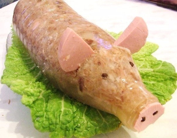 Холодец смешанный - говядина (лытки и кусочки мяса) и свинина (кусочки мяса на косточках, ушки, ножки, части головы).