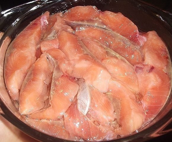 1. Рыбу порезать порционными кусочками, посолить, поперчить, полить лимонным соком по желанию. Оставить на 20 минут.