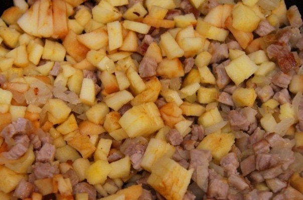 Яблоки обжариваем до консистенции, когда они чуть размягчились, дали сок и обволокли начинку. Солим-перчим по вкусу.
