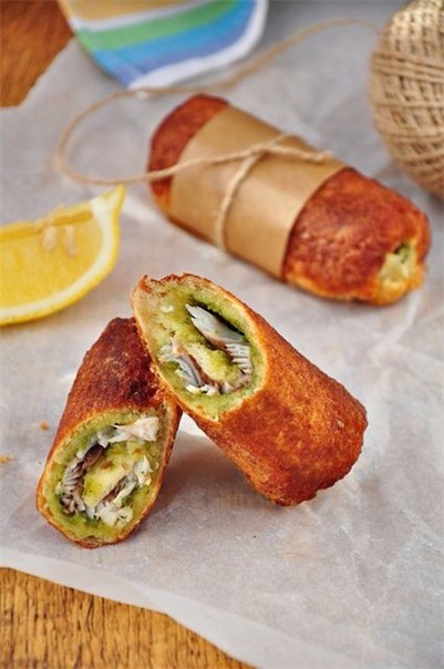 Замечательная закуска как для домашнего перекуса, так и для пикника. Хрустящая корочка, мякиш пропитанный соусом песто и начинка из рыбы..как же это вкусно и очень просто в приготовлении!