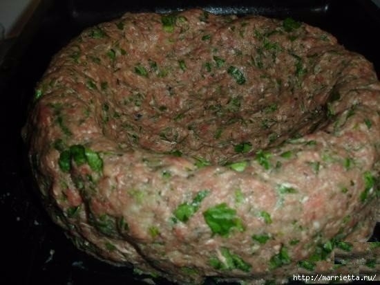 Из фарша сформовать лукошко и выложить его в форму для запекания, предварительно смазанную маслом.