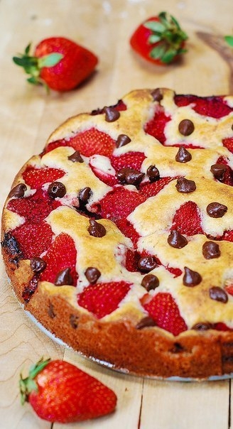 6. Переместите тесто в форму для выпекания. Разместите клубнику на вершине пирога.