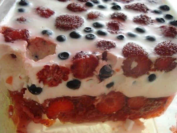 Залили нижний слой с ягодами-застыл за 2,5 часа,потом верхний(сметанный)с ягодами,еще 2 часа.