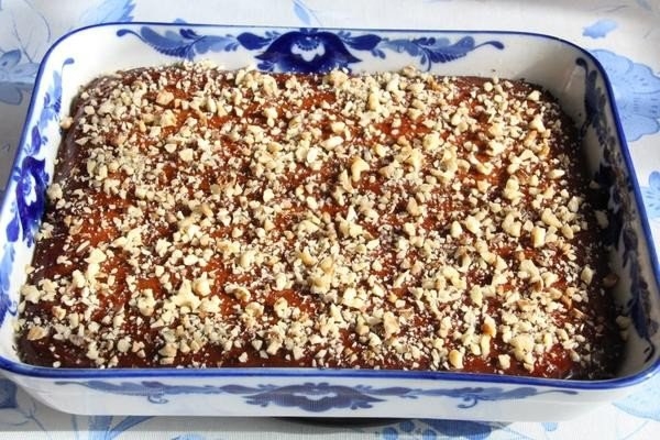 Сразу же, теплую, смазываем медом и посыпаем рубленными орехами. Даем немного остыть перед подачей.