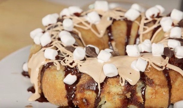 Укрась десерт: полей его шоколадным соусом и растопленной зефирной массой, присыпь оставшейся шоколадной крошкой, маршмеллоу и крекерной крошкой.