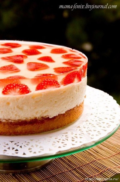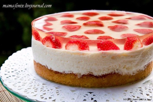 В этот раз использовала тонко нарезанный (5 мм) бисквит женуаз как основу и прослойку между желе и муссом, в пропитку добавила земляничный ликер, и сам мусс делала с новыми уже знаниями (и с итальянской меренгой вместо сырых белков). А так все то же самое.