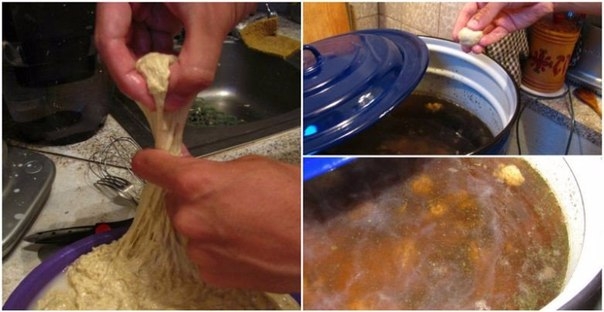 14. И бросаем в заблаговременно приготовленный, кипящий бульон со специями. На 1 кг муки берем 0.5, 0.6 литра воды. Бульон может быть любой. К примеру, овощной (головка лука, целая морковка, перец и лавровый лист) в который добавляются различные травы, применяемые в мариновании.