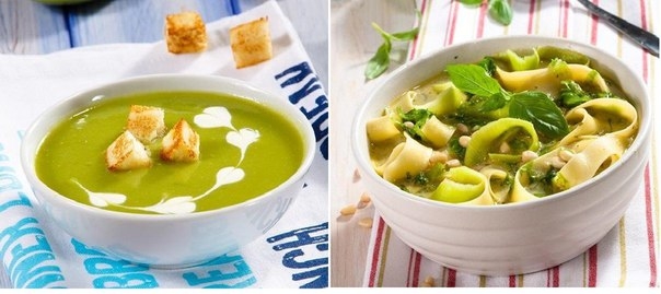 Затем добавить обжаренные лук, лук-порей, сладкий перец и кабачок. Варить еще 10 мин. Суп разлить по тарелкам и подать на стол.
