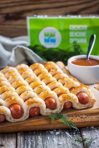 Отличный вариант подачи сосисок в слоёном тесте. Как видите, он отличается от вида обычных сосисок в тесте. Если Вы любите что то приготовить необычное и красивое, тогда пробуйте испечь такую закусочку.