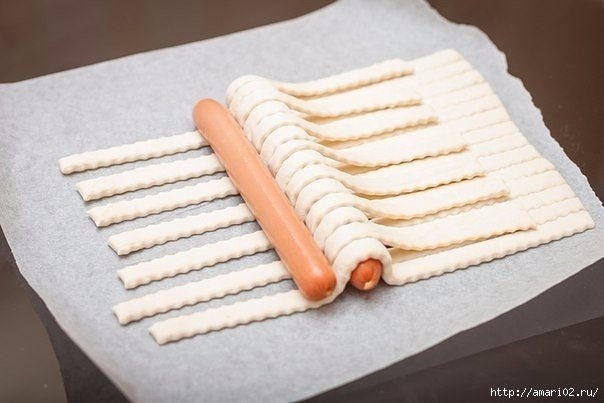 В центр теста, у самого сгиба, положить венскую сосиску.