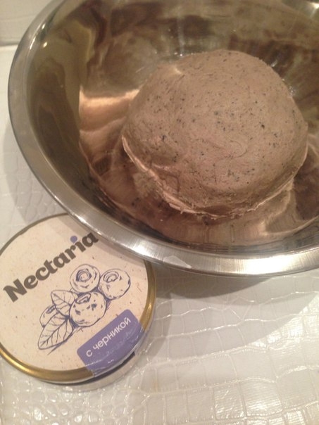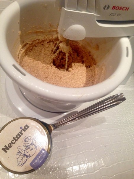 2. Добавляем 150 грамм черничного медового лакомства Нектария. Все хорошо перемешиваем при помощи миксера, масса должна стать светло-золотой.