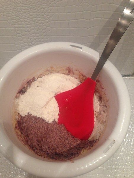 4. В несколько приемов добавляем муку, перемешиваем силиконовой лопаткой до однородного состояния.