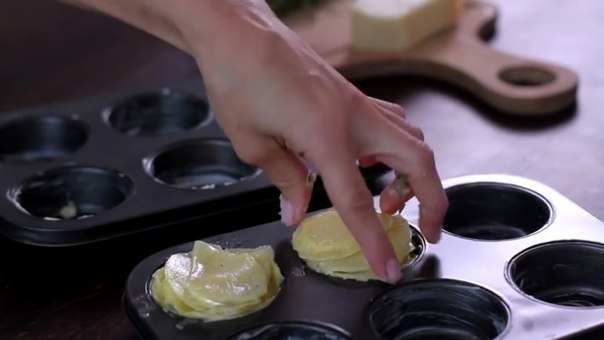 Повар кладет картошку в формочки для кексов. Когда она достала ее из печи, гости озадачились…Выложи картофель в формочки для кексов и снова посыпь сверху небольшим количеством перца и тимьяна.