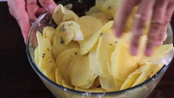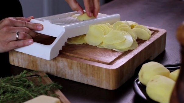 Повар кладет картошку в формочки для кексов. Когда она достала ее из печи, гости озадачились…Почисти картошку и с помощью специального резака тонко нарежь ее. Можно, разумеется, попробовать и ножом, но займет это намного больше времени. Желательно, чтобы кусочки были не толще 2 мм.