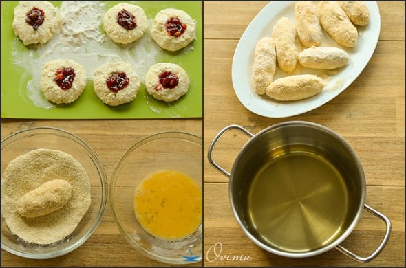 Затем нагреваем фритюр, аккуратно обжариваем их до приобретения золотистости. Выкладываем их на противень и доводим до готовности в духовке при 180 градусах 5-6 мин.