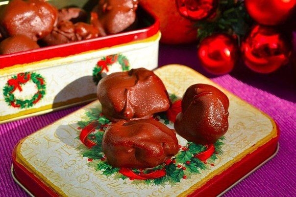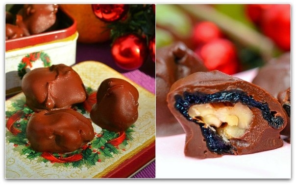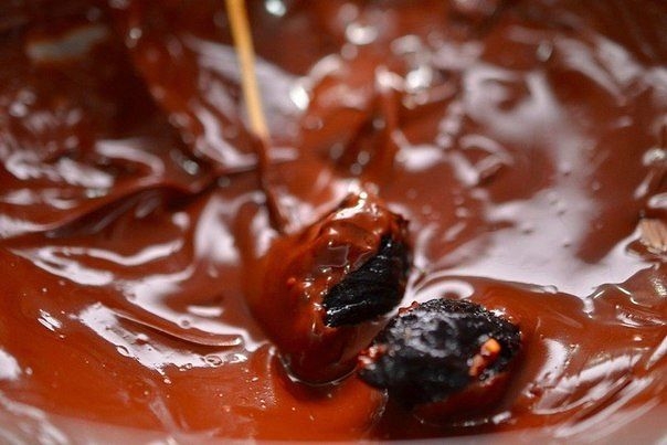 3.Пока шоколад тает, займитесь черносливом. В каждую ягоду на место косточки вставьте орех подходящего размера.