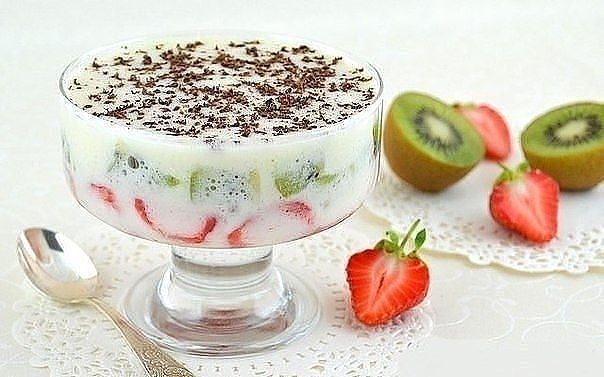 Кладём всё в морозилку на 20 минут. Десерт «Фруктовый» готов!