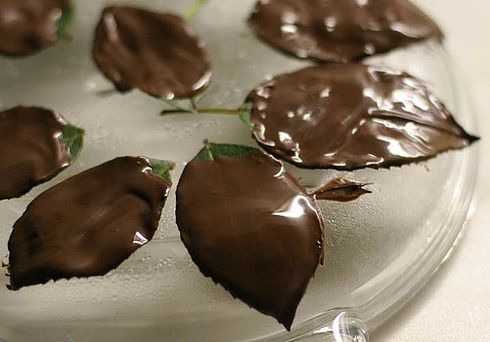 Для изготовления листочков подойдут любые свежие листья, например, от роз. Вымыть их надо с мылом, хорошенько, так как трудно сказать, какими химикатами их брызгали. А шоколад на ваш вкус, главное, безо всяких наполнителей.