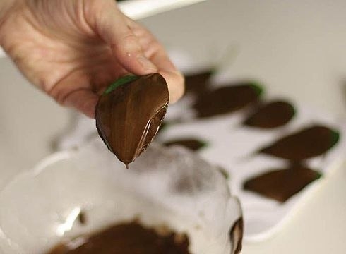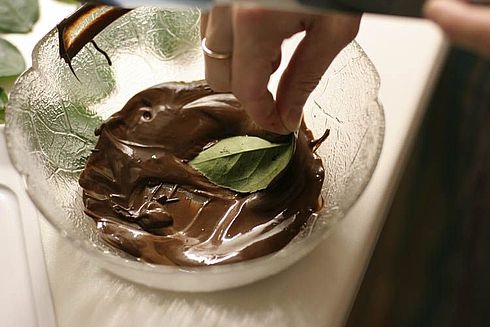 - Шоколад растопить на водяной бане и обмакивать в него одну сторону листочка.