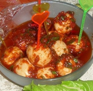 Ингредиенты: 12 вареных перепелиных яиц, 250 г измельченной петрушки, 4 зубчика чеснока, 4 ст.л. томатной пасты (Passata di pomodoro), 6 штук филе анчоуса, 500 мл оливкового масла, 2 ст.л. уксуса Rioja, 2 ст.л. сладкого соуса чили, 1 маленький перец чили, 1 ч.л. сахара