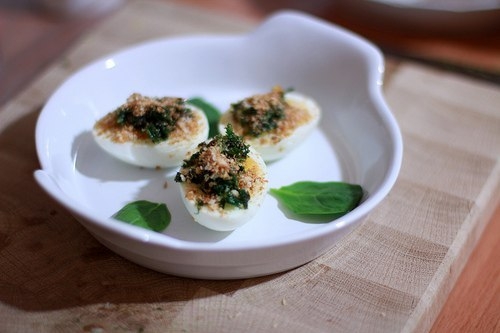 Понадобятся: 6 яиц, 3 ст.л. оливкового масла, 4 ч.л. винного уксуса, соль, 1-2 зубчика чеснока, петрушка, 2-3 ст.л. свежих хлебных крошек.