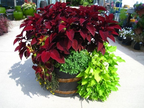 Колеус привычен для нас в качестве комнатного растения, однако он не менее эффектен в уличных цветочных композициях. Очень прост в выращивании, если следовать простым правилам ухода. Летом это растение колеусы требует обильного полива.