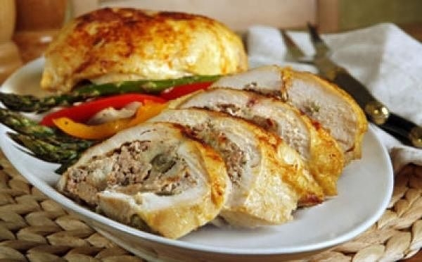На кожу выложите слой фарша, грибы, фасоль и кукурузу, затем снова слой фарша. Края кожи соедините, сшейте нитками. Придайте тушке форму целой курицы.