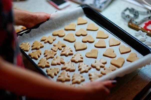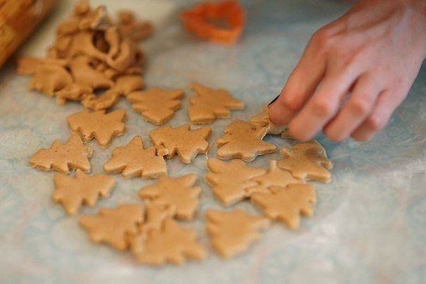 3. Разогрейте духовку до 180 С. На слегка присыпанной мукой столешнице (у меня силиконовый коврик вместо столешницы с мукой) раскатайте тесто в пласт толщиной 0.5 см. Вырежьте формочками фигурки и разложите на противни, застеленные пергаментной бумагой.